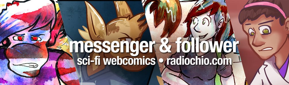 Join the Chio Club! Get monthly rewards and help us continue making comics! When you support Messenger and Follower, you'll get your choice of rewards - early access to pages-in-progress, downloadable desktop wallpapers, or digital comics! Help us keep making comics!